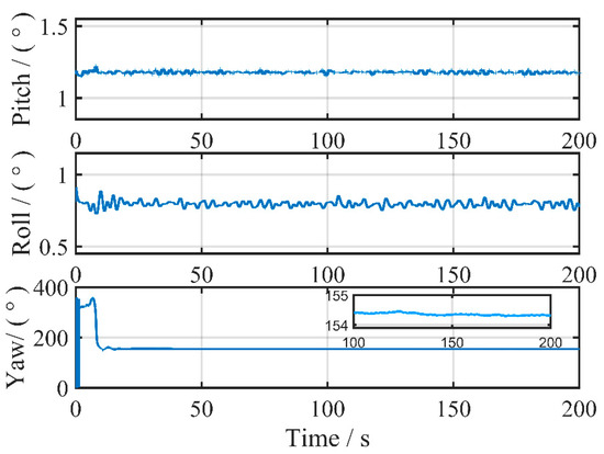 We employed the inertial frame coarse alignment scheme described in Section 2 to obtain the rough initial attitude of the vessel using the position-type double vector obtained from the quadratic integration of the gravity vector. Figure 7 shows the convergence of the three attitudes during inertial frame coarse alignment based on 200 s of data before navigation. The pitch and roll converge quickly and stabilize within a few seconds, while the yaw oscillates for tens of seconds before leveling off. Compared to the analytical coarse alignment method under a static base, the inertial frame coarse alignment method is relatively more time-consuming.