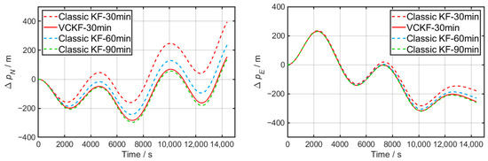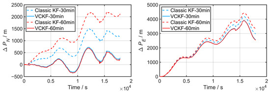 In addition, it can be observed in Figure 12 that the VCKF method achieved significantly smaller navigation error accumulation in both directions compared to the classic KF method.