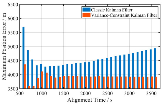 To exclude reason from individual data biases, some more tests are carried out in this section. By extending the fine alignment duration from 600 s to 3600 s in an equal interval of 100 s until the entire mooring stage is all involved in fine alignment, the change in the 5 h maximum navigation error for both the classic KF and VCKF methods within various alignment durations is shown in Figure 13.