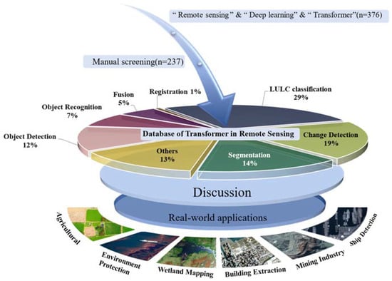 In this work, through a systematic review of the literature, we explored the strengths and weaknesses of transformers for different RS processing tasks. For this, we developed a database of the literature relating to the usage of transformers for RS image analysis tasks and categorized the data into eight RS image-processing tasks: land use/land cover (LULC) classification, segmentation, fusion, change detection, object detection, object recognition, registration, and “other”. Figure 1 illustrates the outline of this study.