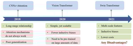 The development process of transformers in CV. The green blocks represent the advantages while the red ones represent the disadvantages.