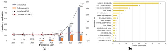 Results of publications. (a) Number of conference papers and journal articles in WOS database for general search on [“deep learning” AND “Transformer”]. “RS” denotes “Remote sensing” has been added to the keywords. (b) Number of relevant publications per journal.