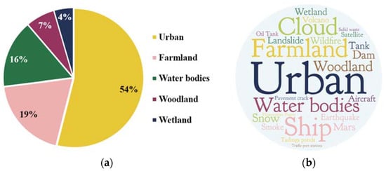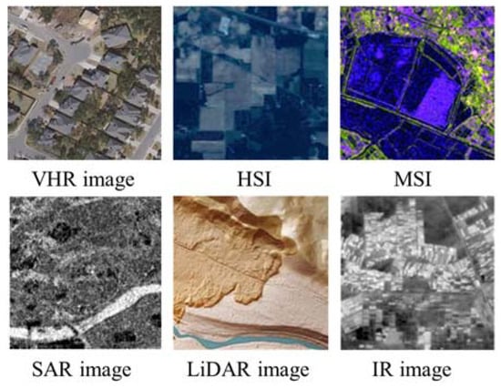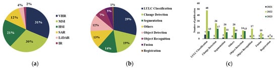 By analyzing the utilization of data in publications, our database came to involve six types of RS data: multispectral images (MSIs) (the spectral resolution is in the range of λ/10), hyperspectral images (HSIs) (the spectral resolution is in the range of λ/100), very high-resolution (VHR) images (lack of near-infrared band compared to MSIs), synthetic aperture radar (SAR) images, light detection and ranging (LiDAR), and near-/mid-infrared ray (IR) images, as shown in Figure 4. Among them, the most frequently used is the VHR image (Figure 5a), which is obtained from satellites and aerial imagery datasets, as well as unmanned aerial vehicle (UAV) imagery datasets. In contrast, other types of data are mostly obtained from various satellite platforms, such as Landsat, Sentinel, and GaoFen. Due to the lower cost and easier access, the RS data of Landsat and Sentinel are most frequently used, in addition to the widely used datasets. HSI images are often used for LULC classification, while SAR images and IR images are often used for object detection. There are also digital elevation models (DEMs), meteorological data, crop yield data, etc., which are used in RS.