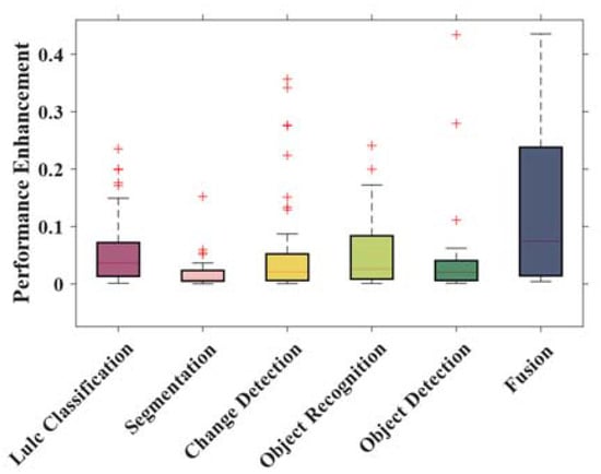 The relative performance of transformer-based methods in each task was next quantitatively investigated. CNN, which widely appeared in comparison methods, was selected as the benchmark for this comparison, to calculate the improvement (percentage) by transformer-based methods, as shown in Figure 6. We found that transformer-based methods have a higher accuracy in fusion and LULC classification tasks, and exhibited a more stable performance (the accuracy distribution is more concentrated) in segmentation and object detection. This stability suggests that the results obtained using transformers for these two tasks can be somewhat anticipated.