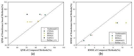 Results in fusion. (a) Scatterplot of QNR comparing transformer-based methods and other methods; (b) scatterplot of RMSE comparing transformer-based methods and other methods.