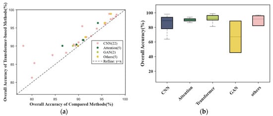 Results in segmentation. (a) Scatterplot of OA comparing transformer-based methods and other methods; (b) boxplots comparing all methods (line in box represents median).