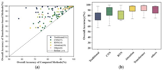 Results in LULC classification. (a) Scatterplot comparing transformer-based methods and other methods; (b) boxplots comparing all methods (line in box represents median).
