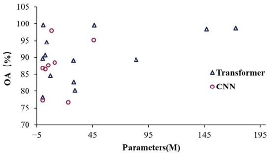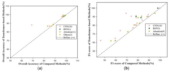 Figure 10 displays the results obtained from analyzing the 44 publications classified as change detection. As demonstrated by empirical studies, CNNs have been extensively employed in change detection tasks [26]. Therefore, we compared the OA in Figure 10a and F1-score in Figure 10b. The scatterplot reveals that attention-based methods exhibit a closer alignment with the diagonal line than CNNs do. This proximity indicates that the performance of attention-based methods is closer to transformer-based methods, since attention mechanisms imitate human attention and generate more discriminative features. So, attention mechanism can enhance the effectiveness of the network when compared with CNNs [27].