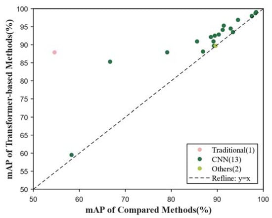 Figure 11 displays the results obtained by analyzing the 29 publications relating to object detection. In object detection, CNN-based methods have emerged as dominant, particularly the YOLO family based on CNNs [28]. Therefore, our statistical analysis primarily compares transformers with CNNs. As demonstrated in the scatterplot, a consistently higher accuracy is exhibited by transformer-based methods across all results. However, due to the extensive research maturity associated with CNNs in object detection, several CNN-based methods closely approach the mean average precision (mAP) achieved by transformer-based methods.