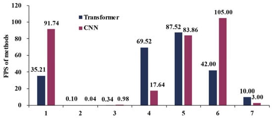 We chose different evaluation matrices for assessing the accuracy of the transformer and CNN models for different tasks and presented them separately in this subsection. Due to a lack of data, our quantitative analysis did not go into a detailed analysis of every task’s impact. Additionally, the evaluation matrices of deep learning models vary across certain tasks, such as object recognition and registration. Therefore, the statistical results we present do not comprehensively cover all records. In this subsection, we present the results on fusion, segmentation, LULC classification, change detection, and object detection, as depicted in Figure 7, Figure 8, Figure 9, Figure 10 and Figure 11.