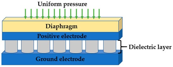 The proposed CPS comprises a four-layered structure, as illustrated in Figure 1. The top layer is a diaphragm made of flexible materials such as PDMS. The second and fourth layers consist of thin parallel plate electrodes that serve as power-supply interfaces for the CPS and that are usually made up of highly electrically conductive materials such as gold, silver, and copper. The third layer was the intermediate layer, positioned between the two electrodes [9]. This dielectric layer exhibited compressibility characteristics that responded to the pressure applied to the diaphragm. Under uniform pressure, the diaphragm undergoes compression, which causes a variation in the thickness of the flexible dielectric layer [10]. This change in thickness directly influences the overall capacitance of the CPS. Consequently, the capacitive response of the sensor is modulated by the mechanical deformation induced by the applied pressure on the diaphragm [11].