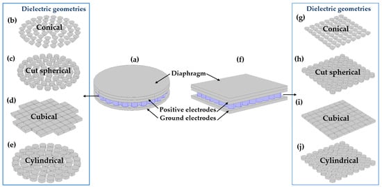 The geometry of the dielectric medium of a CPS plays a crucial role in determining its performance characteristics. The geometry of the dielectric material, which is situated between the electrodes, and the shape, size, and dimensions of the dielectric material affect the sensor’s capacitance, mechanical flexibility, and overall sensitivity to pressure variations.