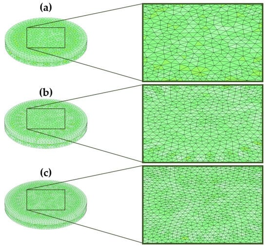 In this study, these factors were systematically examined using several combinations of dielectric geometries and different diaphragm shapes. These combinations were evaluated to determine their effectiveness in optimizing the CPS design. The variation in the dielectric geometry with different diaphragm configurations is shown in Figure 3. Three mesh densities were considered for the present FEM analysis. For the normal mesh, element sizes ranging from 0.1 to 1.5 mm were considered (Figure 4a). For the fine mesh, element sizes ranging from 0.1 to 0.8 mm were utilized (Figure 4b). Finally, for the finer mesh, element sizes ranging from 0.04 to 0.55 mm were employed (Figure 4c).