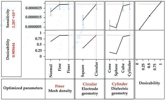 Figure 5 shows the response surface methodology (RSM) optimization plot for the sensitivity of the CPS. This plot helps to determine the best combination of parameters that will result in a higher sensitivity within the range. The optimal parameter values are indicated in red in the figure. By using these values for FEA modeling, desirable sensitivity can be achieved. In this case, the expected desirability predicted is approximately 90.5%. The best combination of parameter levels to obtain a higher sensitivity is a circular geometry for the diaphragm and electrodes and a cylindrical geometry for the dielectric structure. For a better FEM, a finer mesh density is the most desirable.