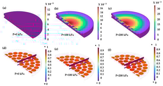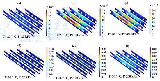 Sliced contour plot of the vertically half cross-section of the CPS to show the temperature effect. (a–c) displacement due to 20 °C at 20, 100, and 200 kPa. (d–f) displacement due to 30 °C at 20, 100, and 200 kPa.