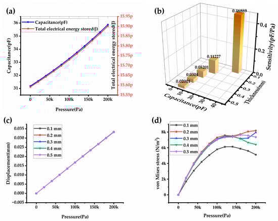 (a) Effect of pressure on the capacitance and total electrical energy stored for 0.1 mm dielectric thickness, (b) capacitive sensitivity characteristics, (c) Effect of pressure on the diaphragm displacement, and (d) von Mises stress analysis.
