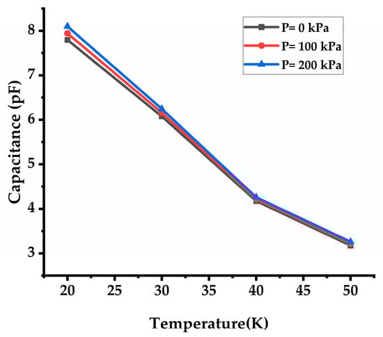 The materials used in the CPS, such as PDMS, PVDF, and Silver, have different coefficients of thermal expansion. As the temperature rises, these materials expand at different rates, leading to mechanical stress within the sensor structure. This stress alters the geometry of the sensor, affecting the distance between the capacitor electrodes and thus the capacitance. In the present study varying applied pressures from 0 to 200 kPa and operating temperatures spanning 20–50 °C are examined. The contour plots in Figure 8a–c depict CPS stress resulting from applied pressures of 20, 100, and 200 kPa on the diaphragm at 20 °C reference temperature. Figure 8d–f illustrate stress development at an operating temperature of 30 °C and pressures of 20, 100, and 200 kPa respectively. The dielectric constant of materials used in the CPS can change with temperature. Typically, as temperature increases, the dielectric constant of materials like PVDF decreases. Since capacitance is directly proportional to the dielectric constant, a decrease in dielectric constant leads to a reduction in capacitance. The effect temperature on the capacitance model is depicted in Figure 9. An increase in temperature results in a higher leakage current between capacitor plates. This leakage current can reduce the effective capacitance of the sensor. These effects combine to result in a decrease in capacitance as the operating temperature of the CPS rises. This reduction in capacitance can impact the sensor’s performance and accuracy, making it important to account for temperature effects in CPS design and calibration.