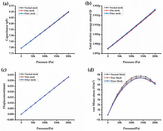 Mesh optimization for the electrical and mechanical parameters. (a) Capacitance against pressure, (b) Total electrical energy against pressure, (c) Displacement magnitude against pressure, and (d) von Mises stress against pressure.