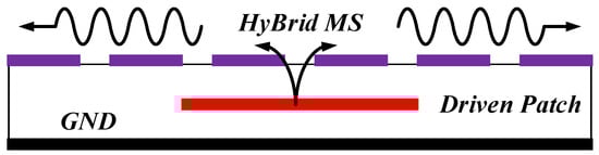 Then, in this paper, we propose a novel design to achieve CP and high gain by adopting an HMS. As shown in Figure 1, the electromagnetic waves emitted from the driver patch are received by the MS and then pass through another MS, merging into surface waves that can generate additional resonance [21]. In contrast to conventional MSs [22,23,24], this design utilizes an HMS consisting of RMS and LCPC MS, which can optimize radiation behavior. Specifically, the LCPC MS can also achieve a reduction in AR values, resulting in enhanced CP bandwidth and additional resonance. To further enhance the properties, an improved HMS was then proposed with the four patches at corners cut. To explain the design process, both CMA and E-field analysis were utilized to analyze the radiated behavior. A 2 × 2 HMS-based array antenna with sequential rotation was proposed, resulting in significantly enhanced properties. Simulated and measured results then effectively demonstrated the properties of the designed antenna.