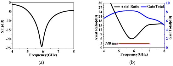 The simulated results of the slotted patch antenna with the improved HMS superstrate: (a) S11 and (b) AR and GainTotal.
