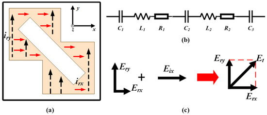 LCPC unit cell: (a) surface currents behavior, (b) equivalent circuit, and (c) the sketch of the superposition of the incident and reflect field.