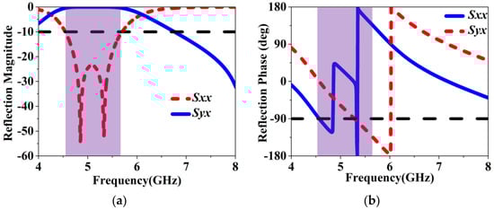 Utilizing a Floquet–port setup depicted in Figure 5, we investigate the reflection properties of the unit cell. The unit cell is exemplified by the presence of incident waves in the x-polarization. When an x-polarized wave is incident, Sxx and Syx serve as indicators of the reflection coefficients for waves reflected in the x-direction and y-direction, respectively. Enhanced polarization conversion is achieved when Sxx is minimized and Syx is maximized. This results in the suppression of the reflection wave’s x-direction component and its conversion into a y-direction component across a wide frequency range. At 5.3 GHz, Syx measures around 0.99 on a linear scale with a negative 90-degree phase shift, suggesting that the wave reflected in the y-direction lags 90 degrees behind the incident wave in the x-direction, thereby generating RHCP waves at 5.3 GHz.
