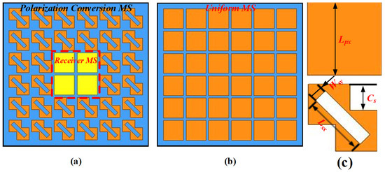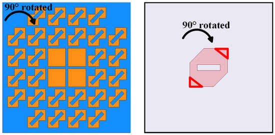 But, following our novel design that separates the receiver and transmit stages, as depicted in Figure 6a, the proposed PCMS superstrate consisted of squared patches arranged in the center, with LCPC unit cells surrounding it, which can then be viewed as a hybrid MS (HMS). According to the functions they fulfill, the HMS can also be regarded as a combination of a receiver MS (RMS) and a PCMS, as detailed in Figure 6. The linearly polarized waves emitted from Ele.a were first received by the RMS and then converted into circular polarization as they passed through the PCMS, ultimately radiating into space as CP waves.