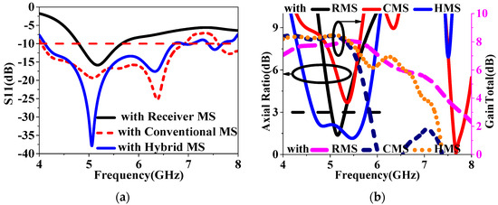 Then, the RMS-only superstrate-based (RMSSA) and HMS superstrate-based antenna (HMSSA) were both simulated in HFSS 15, where the results are plotted in Figure 7. As shown in the Figure 7a, HMSSA achieves an S11 bandwidth of 3 GHz, ranging from 4.1 GHz to 7.1 GHz, while a narrow bandwidth is realized by the RMSSA, with only one resonance frequency. As for the ARs achieved by HMSSA, the bandwidth is wide, at 1.2 GHz, ranging from 4.6 GHz to 5.8 GHz, with the minimum value reaching 1 dB, and the RMSSA could also realize CP radiation, but with a slightly narrower bandwidth of 0.1 GHz, as shown in Figure 7b, demonstrating that the RMS can receive most LP waves ranging in an wide band and reduce AR values in an certain degree. It can also be observed that the HMSSA obtains an average value 1 dB higher than the RMSSA. Through the simulations analysis above, it can then be demonstrated that the hybrid design for MS has the potential to be applied to the wideband CP and high-gain antennas. Moreover, to well validate this design approach further, a squared conventional uniform MS-based superstrate antenna (CMSA) was then also simulated for comparison with the HMSSA, and the results are shown in Figure 7. It can be observed that the HMSSA achieves a wider CP bandwidth, with an additional AR minimum, compared to those of the CMSA, although the similar as in the S11. However, the AR minimums of the CMSA fail to meet the 3 dB line at lower frequencies, and the gains significantly decrease at frequencies higher than 5.5 GHz, as illustrated in Figure 7. Thus, the proposed HMS has a capable wideband PC ability that can be applied to wideband CP and high-gain radiation design.