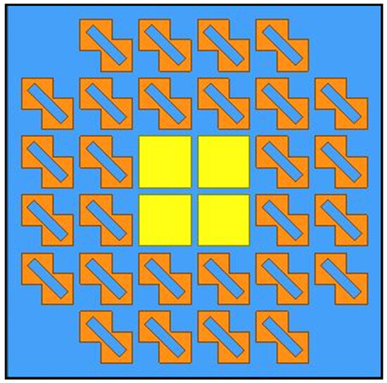 Then, in recent work, an increasing number of non-uniform MSs have been used in the design of CP antennas due to their flexible control of phase correction, resulting in improved radiated performance [13,14,15]. In our previous work [16], we proposed a nonuniform MS design consisting of a corner-cut slotted patch at the center and 45° oblique slotted square patches surrounding it as a radiator, which then achieved significantly improved gain and bandwidth. As reported in [17], a nonuniform MS arranged with unequal patches was demonstrated to achieve a bandwidth greater than 84% and an aperture efficiency of 96%. In particular, in [18], a non-uniform MS was proposed with a centered 2 × 2 array of unequal patches surrounding it, and then arranged in a 2 × 2 array with sequential rotation, ultimately achieving a remarkable enhancement in bandwidth and reduction in RCS. However, the MS-based antenna cell itself cannot achieve CP radiation. An introduction is made of a 2 × 2 nonuniform MS arranged with simple rectangular patches. By employing an appropriate feed network design, orthogonal modes were achieved, leading to remarkable radiated behavior, as reported in [19]. It is worth noting that CP modes are excited through both the feed network and the MSs, which adds complexity to the antenna design. But, this approach confirms that employing MSs as a substrate or superstrate has been a successful method for enhancing the bandwidth of CP patch antennas.