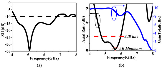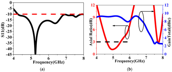 Simulated results of the LHCP HSMS–based antenna: (a) S11 and (b) AR.