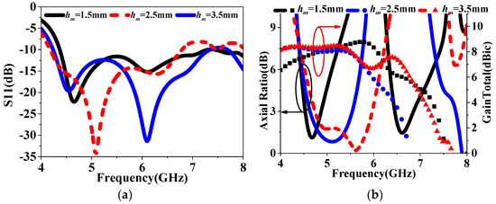 The simulated results of (a) S11 and (b) Axial Ratio and GainTotal versus frequencies with different height, hm.