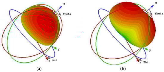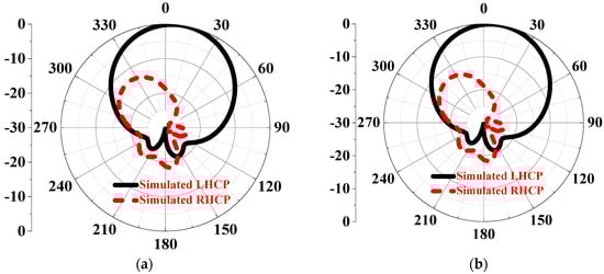 Simulation of the radiation pattern of the LHCP HMS–based antenna at 5.3 GHz: (a) xoz plane and (b) yoz plane.