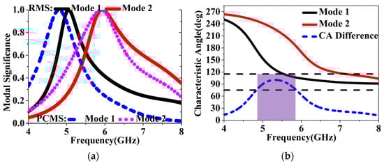 To further validate the PC properties of HMS, CMA [16,17,18,19] was then utilized to clearly explain the design process, considering the inherent properties of the conductor structure calculated without the addition of excitation. To achieve circular polarization (CP) properties with CMA-aided design, the following conditions must be met: Firstly, ensure that the two MS values are equal and exceed 0.707; Secondly, maintain a 90° phase difference between the CAs of the two modes; Thirdly, confirm that the current surfaces generated by the two modes are orthogonal; Lastly, ensure consistency in the direction of maximum radiation. The MS values, CAs, surface currents, and radiation patterns were then analyzed using the multilayer solver in CST2019. As shown in Figure 14a, the MSs of the first two modes, with values equal to 1, were observed to occur at 5.05 and 5.93 GHz for RMS, and at 4.78 and 5.89 GHz for the HMS, respectively, which implies that the two MSs resonate at the similar frequencies. Furthermore, resonant frequencies of modes 1 and 5 for both RMS and PCMS are approximately the same as those of the HMSA and IHMSA, as presented in Figure 14a It can be concluded that the modal behaviors of PCMS can be effectively integrated with those of RMS. Then, it thus demonstrates that further design can proceed by combining the two MSs together. From Figure 14b, it can be observed that the phase difference between modes 1 and 2 is 75–105° within the frequency range of 4.8 to 5.8 GHz, indicating that they can be considered as orthogonal modes.