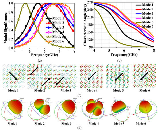 As illustrated in Figure 17, the first six modal behaviors of HMS were also explored. As shown in Figure 14a, HMS resonates at 5.56, 6.24, 6.59, 6.74, 4.7, and 6.93 GHz, corresponding to values that are equal to 1. It is thus confirmed that mode 5 should be chosen as the one operation mode because its resonant frequencies fall within the operated band. Through further observation, it was found that only the MS corresponding to the overlapping frequency of modes 1 and 5 is greater than 0.707. Hence, Mode 1 and Mode 5 are chosen as the operation modes for the further CP design. Figure 17b shows the CAs of modes 1–6, where a nearly 90° phase difference between mode 1 and mode 5 at 5.5 GHz can be observed. Currents were also investigated, as shown in Figure 17c. From the figure, it can be observed that the maximum current appears in the lower right direction for mode 1. Mode 2 displays a pair of opposite maximum currents separated on both sides of the diagonal, while the maximum currents for modes 4–6 all point in the lower left direction. As shown in Figure 17d, modes 1 and 5 exhibit a similar radiation pattern along the z-axis. We can hence conclude that modes 1 and 5 are a pair of orthogonal modes that can generate CP properties.