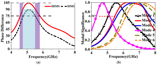 Furthermore, the modal behaviors of the IHMS were also analyzed in the design process to achieve enhanced properties. The MSs of the first six modes were depicted in Figure 18b, from which we can see that the operation modes were modes 1 and 4, as the MSs of the overlapped frequency covered by both modes are greater than 0.707 within the operation band. As depicted in Figure 18a, the frequencies band corresponding to the CAs differences ranging from 75° to 105° is wider than that of HMS, with both the lower and higher bands increased. Therefore, it can be indicated that the IHMS can achieve an enhanced CP band at lower and higher frequencies compared to the HMS. It can then be concluded that improved properties were achieved through the adoption of IHMS in this design.