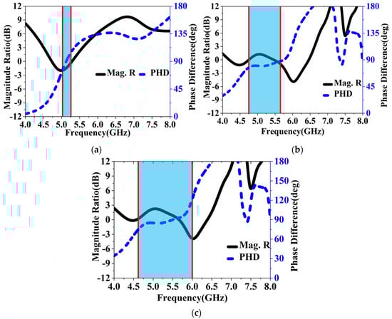 To further demonstrate this design, we also simulated the E-field radiated from the patches arranged in an MS configuration. It can then be resolved into two mutually orthogonal components, namely Ex and Ey, along the x and y directions. Generally, when the far-field Ex and Ey have equal magnitudes but a 90° phase difference, perfect circularly polarized radiation can be achieved. As shown in Figure 19, the magnitude ratios and phase differences of the two components, Ex and Ey, in the boresight radiated by the three MS have been investigated. It is worth noting that in engineering, CP modes would be generated only when the absolute value of the ratio is not higher than 3 dB and the phase difference variation is not higher than 15° compared to a perfect CP mode. Considering this, it can be observed from the figures that the CP mode generated bands highlighted in blue range from 5.02 to 5.26 GHz for RMS, 4.75 to 5.65 GHz for HMS, and 4.62 to 6 GHz for IHMS, respectively, which is consistent with the results analyzed by CMA. Furthermore, The LCPC frequencies shifted to lower and higher bands, resulting in a wider LCPC band when IHMS was utilized compared to HMS. It can hence be concluded that IHMS has a wider LCPC band than RMS and HMS, which could be applied as a superstrate in this design for wideband CP and high gain.