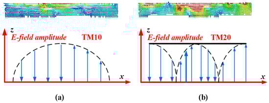 Simulated E-field distributions along the center of the IHMSA for (a) TM10 and (b) TM20 at 5.2 GHz and 6.2 GHz, respectively, as well as a schematic of the operational mechanism.