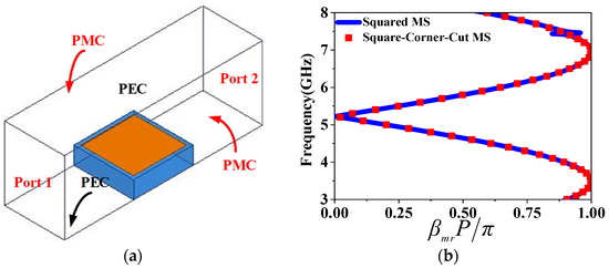 (a) Transmission-line model in HFSS.15 and (b) dispersion diagrams of the square MS and square-corner-cut MS unit cell.