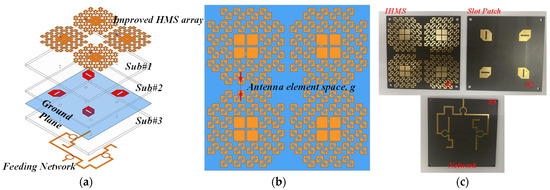 The sketch of the improved HMS–based slot patch antenna array: (a) 3D view and (b) top view, and (c) photos of the fabricated array antenna.