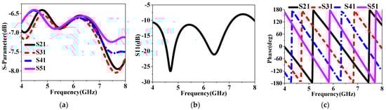The behaviors of the feeding network: (a) S parameter, (b) S11, and (c) phase.