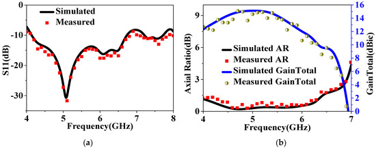 Simulated and measured results of the proposed IHMS–based patch array antenna: (a) S11 and (b) axial ratio and gain total.