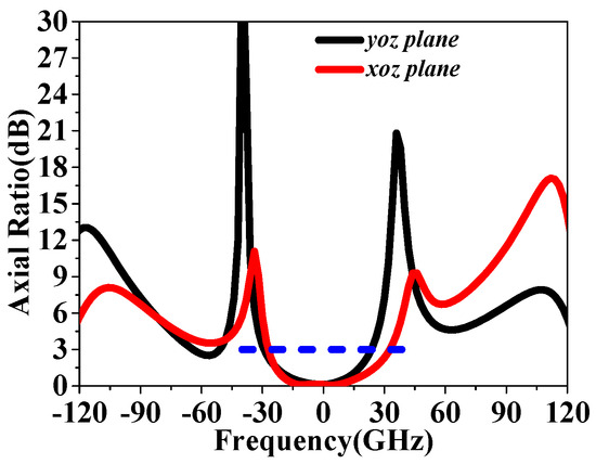 Simulated AR values versus the angle at 4.7 GHz in xoz and yoz plane, respectively, at 4.7 GHz.