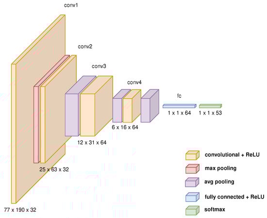 Convolutional neural networks allow the automatic detection of relevant information without human supervision [22]. They use convolution and pooling operations. In CNN, the input data is a multidimensional array, while in other simple artificial neural networks, it is one-dimensional. To prevent the padding problem, extending output is filled with zeros when the output differs in size from the input. CNN comprises a few convolutional layers with the Rectified Linear Unit activation function (ReLU). Each layer is a collection of filters with parameters , where w denotes width, h height, and d depth, respectively. The number of activation maps at the output equals the number of filters in a single layer. The output from the convolutional layers is downsampled by using pooling layers. The pooling layer maintains the most relevant information while decreasing the input’s spatial size. In the aggregation process, a window of predefined size is shrunk to a single element (usually with an average or maximum value in a window). The part of the network responsible for input data classification follows convolutional layers. It comprises a few fully connected layers with the softmax function.