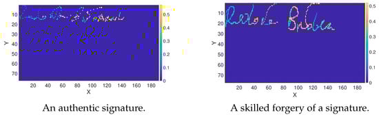 Convolutional neural network models are incredibly efficient in image recognition. They successfully learn values in specific points of the image and their arrangement in space. Thus, the input data are images. Signature data samples collected with mobile devices are vectors of two coordinates x and y, and pressure values p. Therefore, to use the potential of CNN, we converted handwritten signatures into images with pressure values corresponding to the pixels. Figure 4 depicts the example signature representation after conversion.
