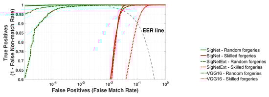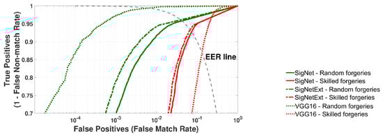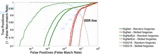 The metrics described in Section 4 were used for the performance evaluation of SigNet, SigNetExt, and VGG-16 classifiers. Figure 7 presents the average ROC curves calculated based on 20 rounds of experiments for the testing datasets (TestSet) randomly selected input datasets from the DataSet. The average EER values and their standard deviations are collected in Table 3. The goal was to classify all samples from a given test set, i.e., signatures that were not used in classifier training and validation.