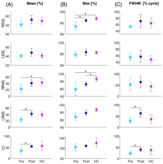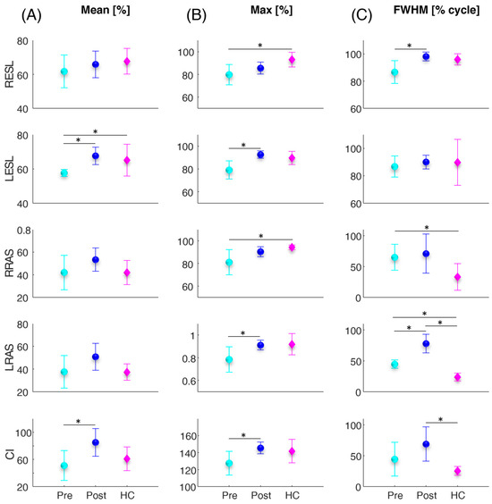 Average (circles and diamonds) and standard deviation (vertical lines) values over all subjects of the mean (A), maximum (max) (B), and full width at half maximum (FWHM) (C), of the four investigated trunk muscles (RESL, LESL, RRAS, LRAS) and of the co-activation function (CI) for the patients before and after the vertebroplasty surgery (cyan and blue filled circles denoted as Pre and Post, respectively) and for the healthy controls (magenta filled diamonds denoted as HC) computed during the sit-to-stand task. The asterisks (*) indicate significant differences.