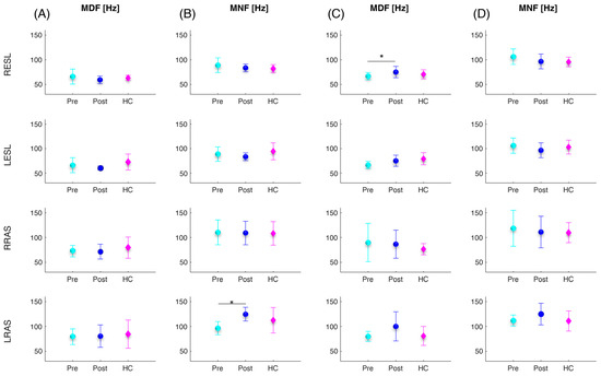 Mean (circles and diamonds) and standard deviation (vertical lines) values over all subjects of the median (MDF) and mean (MNF) frequency of the four investigated trunk muscles (RESL, LESL, RRAS, LRAS) for the patients before and after the vertebroplasty surgery (cyan and blue filled circles denoted as Pre and Post, respectively) and for the healthy controls (magenta filled diamonds denoted ad HC) computed during the sit-to-stand (A,B) and lifting (C,D) tasks. The asterisks (*) indicate significant differences.