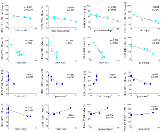 Data scatter plots and the fit line together with the Pearson’s coefficient (r) and the statistically significant p values between co-activation and trunk muscle parameters and the BPI items in patients with MM before (cyan dots) and after (blue dots) the surgery in the sit-to-stand activity.