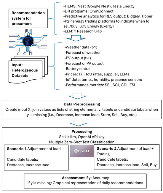 Recommendation systems for prosumers in the context of energy management involve sophisticated algorithms designed to analyze various data points, like energy production, consumption patterns, weather forecasts and market prices, even social media insights and news [8] to provide personalized advice. These systems aim to optimize energy use, reduce costs and even generate revenue by engaging in energy trading [9]. General types of recommendation systems and technologies that play a significant role for prosumers in the energy sector are usually associated with the following: (a) smart home energy management systems or HEMSs, systems which integrate with smart home devices and RESs (like solar panels) to optimize energy consumption [10] and which may suggest the best times to use energy-intensive appliances based on the lowest energy prices or highest RES production, contributing to cost savings and increased energy efficiency [11,12]; (b) demand–response (DR) programs, which are often run by utilities to incentivize prosumers to reduce or shift their energy consumption during peak intervals [13,14] and which include recommendation systems that may alert users to these opportunities, advising when to decrease usage or temporarily store energy in home batteries for later use or sale back to the grid; (c) predictive analytics for RES production, which forecast production levels based on weather data and historical performance and which may recommend optimal times to store, use or sell energy, maximizing the financial and environmental benefits of RES installations [15]; (d) peer-to-peer (P2P) energy trading platforms, through which emerging blockchain and digital platform technologies enable P2P energy trading, allowing prosumers to sell excess renewable energy directly to neighbors or other local consumers [16,17] and which may suggest the best times to buy or sell energy based on market trends and individual consumption patterns; (e) LLMs and other artificial intelligence (AI) technologies for personalized recommendations, which may analyze vast datasets to provide tailored advice for energy management [18] and which consider the unique preferences and behaviors of each prosumer, offering personalized recommendations for optimizing energy usage and participation in LEMs.
