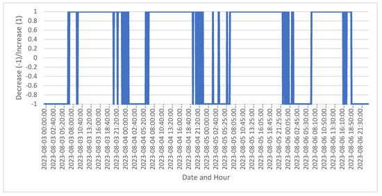 Figure 2 shows 5-min interval recommendations from 3 August to 6 August 2023, with the potential labels “Increase” (1) and “Decrease” (−1). An interpretation of the chart is provided: the Y axis represents recommendations as binary outcomes. The value 1 indicates a recommendation to “Increase” load and −1 indicates a recommendation to “Decrease” load, whereas the X axis shows dates and times, marked at 5-min intervals over four days, from 3 August to 6 August 2023. It shows alternating periods where the recommendation switches between “Increase” and “Decrease” load. This suggests a dynamic situation where conditions or factors evaluated at these intervals are frequently changing. Some hours (like night and day hours) show a consistent recommendation (either to increase or decrease), which suggest more stable or predictable conditions during these periods. Other periods, notably around midday across the days, show more frequent switches between “Increase” and “Decrease” load. This reflects more volatile or variable weather conditions needing quick responses. Each day might have slightly different patterns, which are influenced by different external factors not shown on the chart but affecting the recommendations. This chart provides a clear, quick reference for actions recommended at regular intervals, reflecting an automated, data-driven decision process. In Table 3, sample data for the first scenario is provided.